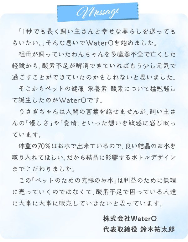 物価が上がり、日々の生活費もどんどん上がっている中でもWaterOを使い続けてくださるお客さまがたくさん居てくださって、今日まで事業を続けることが出来ました。スタッフ一同、心より感謝申し上げます。このタイミングにて、お客さまに1日でも末永く使って頂けるブランドとなるべく、1匹でも多くのペットの健康を守れるブランドとなるべく、定期コースの価格を見直しさせていただきます。