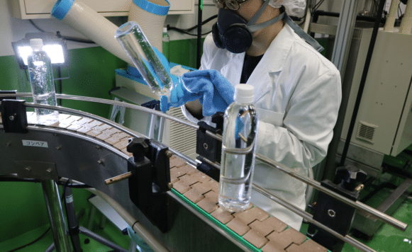 充填機でWaterO専用ペットボトルに